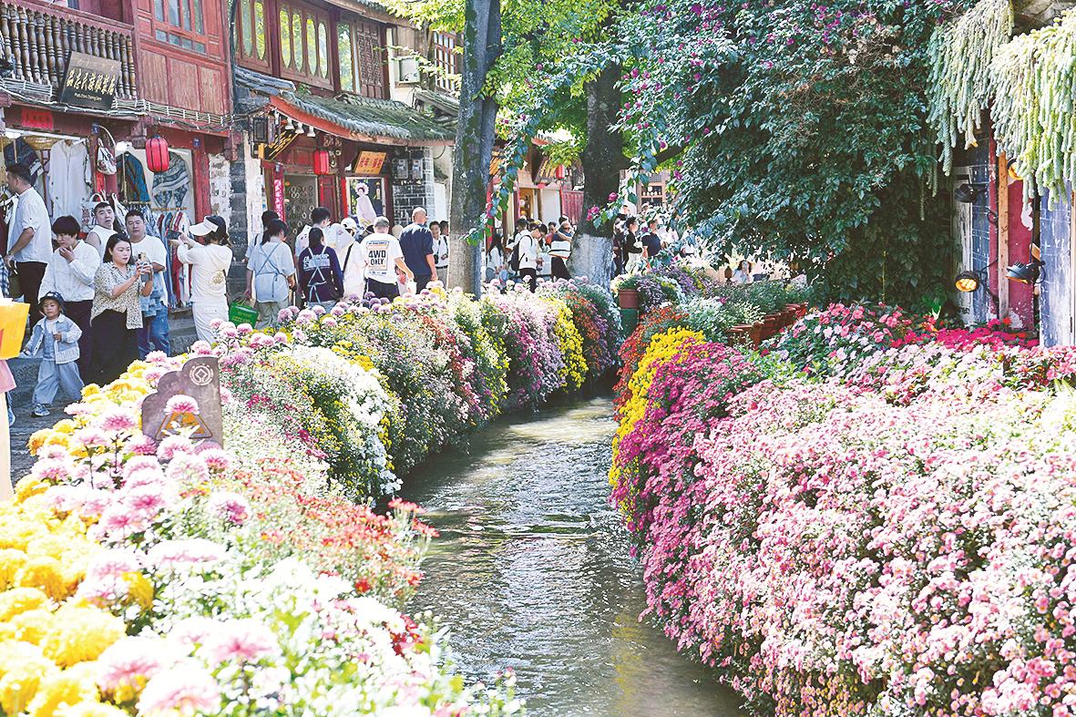 广东游客柯楠说:“一进古城,就被各种鲜花惊艳到了。这个季节还能看到这么多花,丽江的生态环境真好。以花为背景拍照,特别出片。”